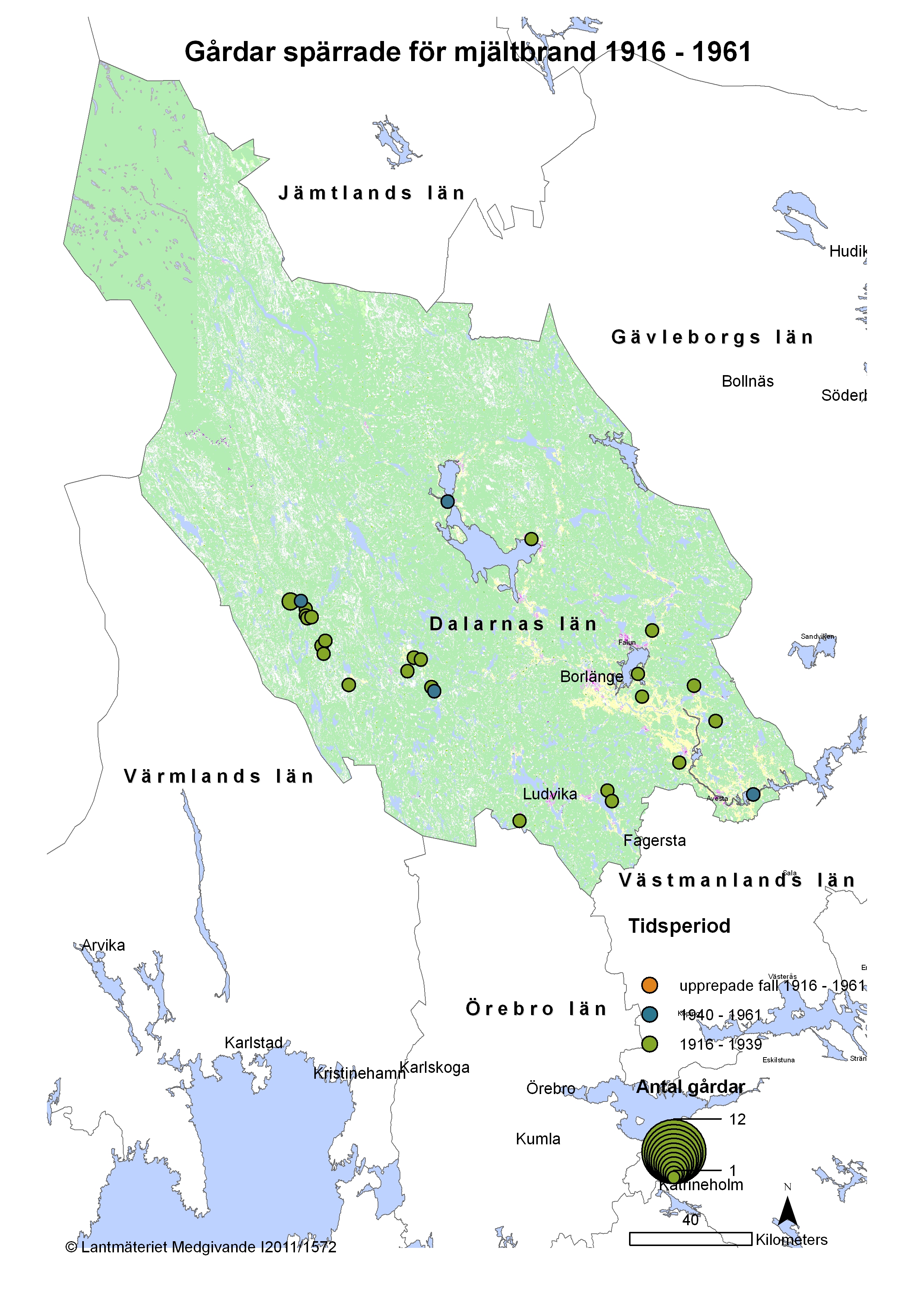 Projektet avslutades 2012. I botten hittar du länkar till kartor som visar mjältbrandsutbrott på gårdar i hela Sverige, och i olika län, mellan åren 1916-1961. Uppgifterna om gårdar som har haft fall av mjältbrand har främst hämtats från Länskungörelser men även från Länsveterinärers diarier och veterinärrapporter.